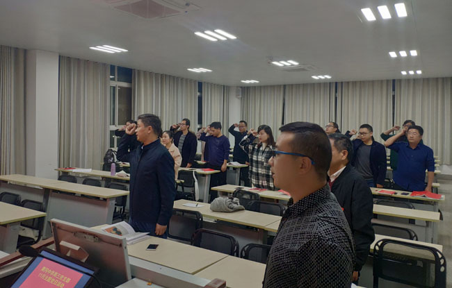本次活動嚴格按照“5+X”的模式進行,在完成通報黨費繳納情況、奏唱國歌、重溫入黨誓詞、誦讀黨章等規(guī)定動作之后,認真?zhèn)鬟_學習了中國共產(chǎn)黨十九屆四中全會精神,《關(guān)于在全省第二批“不忘初心、牢記使命” 主題教育中注重開門抓教育的通知》《習近平新時代中國特色社會主義思想學習綱要》等內(nèi)容。