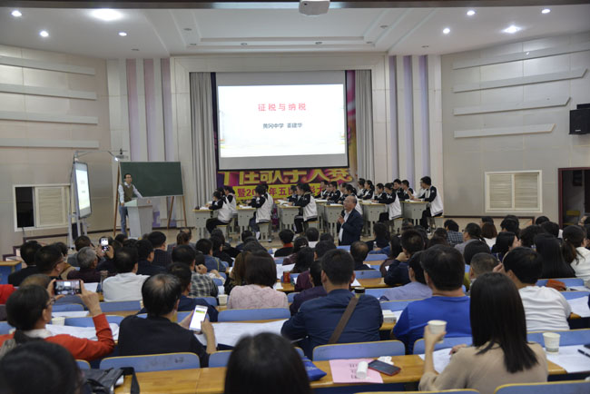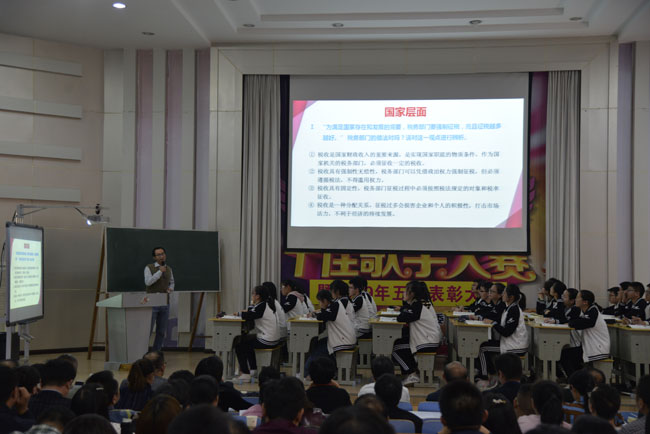為深入貫徹習近平總書記在思想政治課教師座談會上重要講話精神, 10月19日下午,黃岡市深化新時代學校思想政治理論課改革創(chuàng)新示范課(高中)活動在我校西報告廳舉行。黃岡市教育局副局長皮建明蒞臨指導,來自黃岡市各縣(市)區(qū)的教育主管部門負責人和思政課教師共100多人參加聽課?;顒佑晌倚8毙iL王實泉主持,我校政治教研組長姜建華老師主講了一節(jié)題為《征稅與納稅》的示范課。