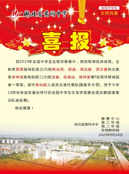 在2020年全國(guó)中學(xué)生生物學(xué)聯(lián)賽中,我校取得優(yōu)異成績(jī)。主教練黃蓉指導(dǎo)的高三(9)班陳燦陽(yáng)、胡逸、周遠(yuǎn)鵬、鄒方睿和主教練李神斌指導(dǎo)的高二(9)班涂畫、楊逸佳、陳燁豪等7名同學(xué)獲得國(guó)家一等獎(jiǎng)。其中陳燦陽(yáng)入選湖北省代表隊(duì)(國(guó)家冬令營(yíng)),將于今年10月份參加在重慶舉行的全國(guó)中學(xué)生生物學(xué)競(jìng)賽全國(guó)決賽(國(guó)家集訓(xùn)隊(duì)選拔賽)。