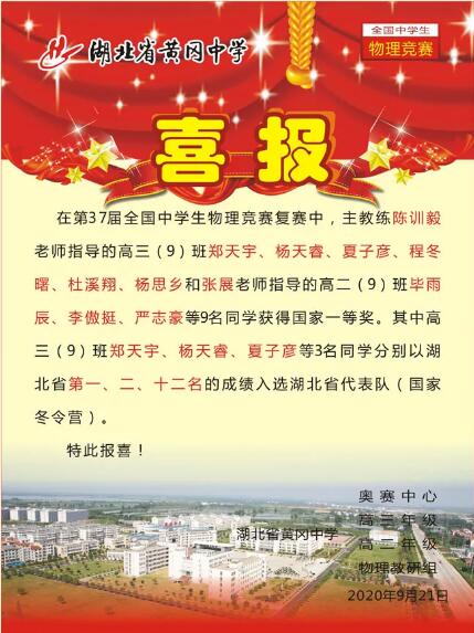 在第37屆全國(guó)中學(xué)生物理競(jìng)賽復(fù)賽中,主教練陳訓(xùn)毅老師指導(dǎo)的高三(9)班鄭天宇、楊天睿、夏子彥、程冬曙、杜溪翔、楊思鄉(xiāng)和張展老師指導(dǎo)的高二(9)班畢雨辰、李傲挺、嚴(yán)志豪等9名同學(xué)獲得國(guó)家一等獎(jiǎng)。其中高三(9)班鄭天宇、楊天睿、夏子彥等3名同學(xué)分別以湖北省第一、二、十二名的成績(jī)?nèi)脒x湖北省代表隊(duì)(國(guó)家冬令營(yíng))。
