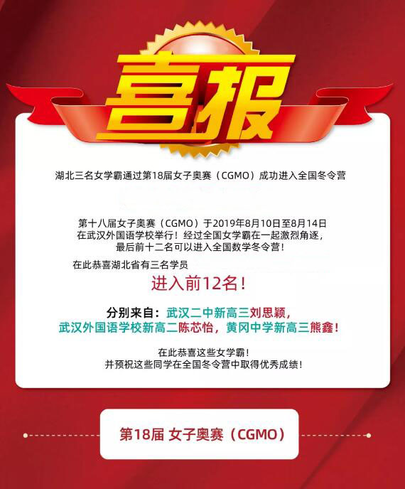 第十八屆女子奧賽(CGMO)于2019年8月10日至8月14日在武漢外國語學(xué)校舉行,經(jīng)過全國女學(xué)霸在一起激烈角逐,最后前十二名可以進(jìn)入全國數(shù)學(xué)冬令營。