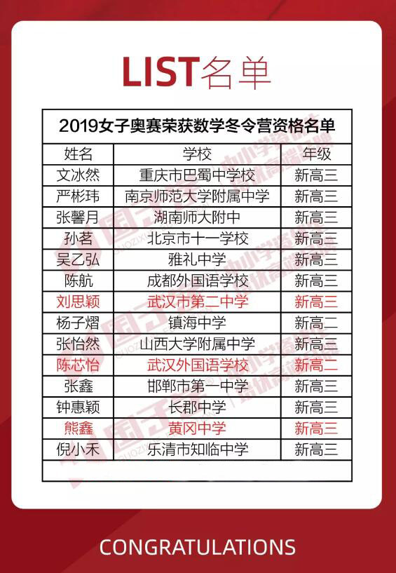 湖北省有三名學(xué)員進(jìn)入前十二名,入選冬令營。我校熊鑫同學(xué)入選冬令營。