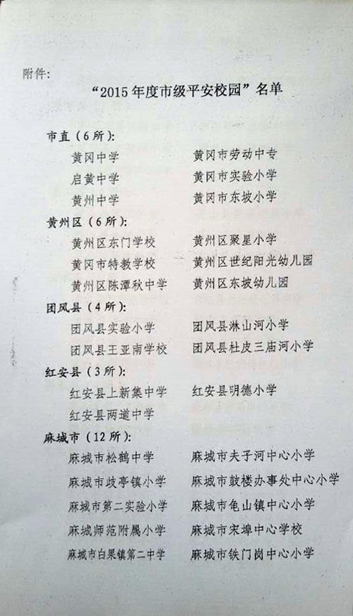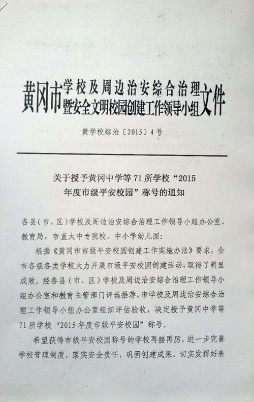 2016年初,學校及周邊治理綜合領(lǐng)導小組暨安全文明創(chuàng)建工作領(lǐng)導小組對我校進行了全方位檢查,檢查團對我校安全及文明工作給予高度評價,并認定我校為2015年度市級平安校園。