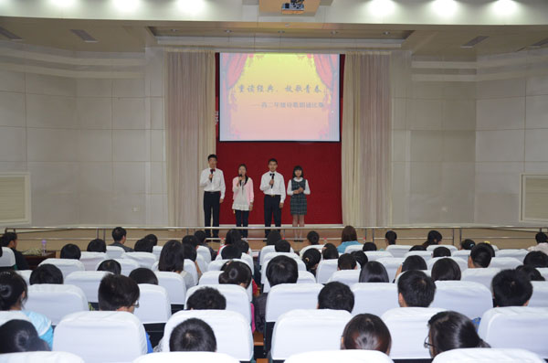 10月23日下午,高二年級在報告廳舉辦“重讀經(jīng)典 放歌青春”詩歌朗誦比賽。來自高二年級的24組同學(xué)參加本次比賽,高二年級200余位學(xué)生到現(xiàn)場觀看了比賽。