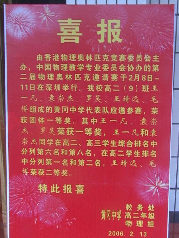 我校高二(9)班王一凡、袁崇杰、羅昊、王靖遠(yuǎn)、毛博組成的黃岡中學(xué)代表隊(duì)?wèi)?yīng)邀參賽,榮獲團(tuán)體一等獎(jiǎng)。其中王一凡、袁崇杰、羅昊榮獲一等獎(jiǎng),王一凡和袁崇杰同學(xué)在高二、高三學(xué)生綜合排名中分列第六名和第八名,在高二學(xué)生排名中分列第一名和第二名,王靖遠(yuǎn)、毛博榮獲二等獎(jiǎng)。