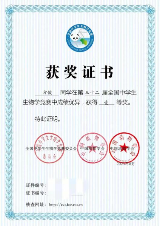 方俊在全國(guó)中學(xué)生生物競(jìng)賽中獲得