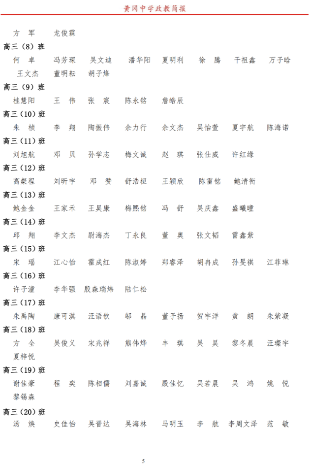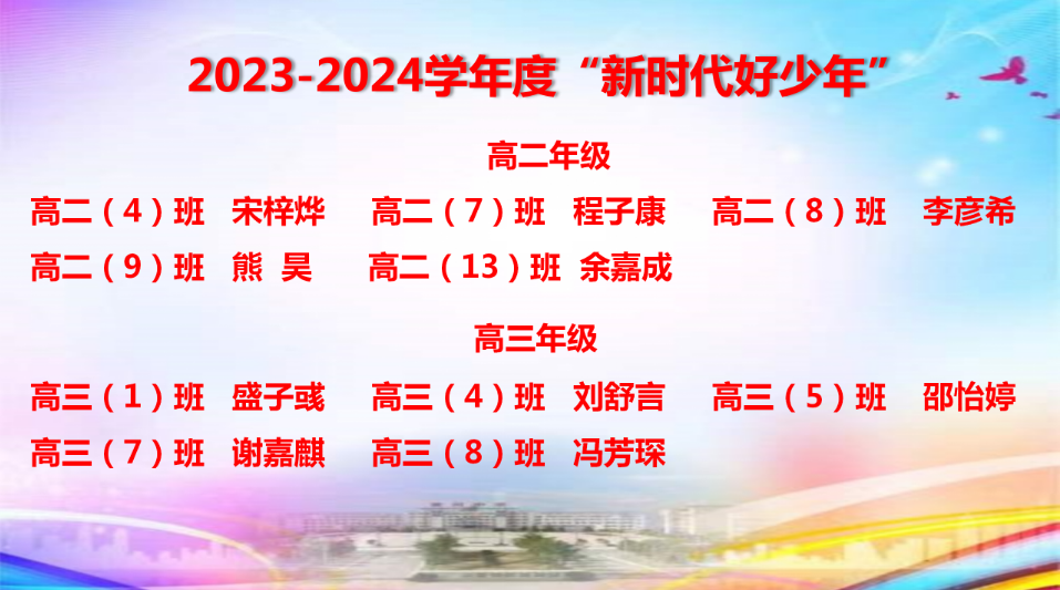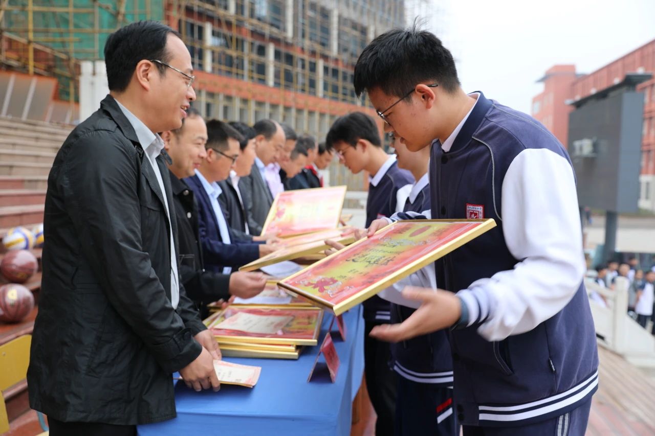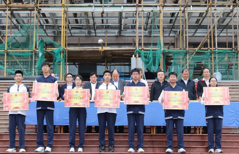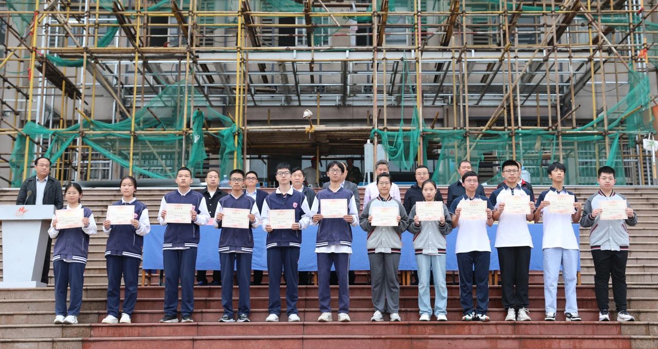 紀(jì)委書記劉伯永宣讀了《關(guān)于表揚(yáng)先進(jìn)班集體和優(yōu)秀個人的決定》,高二(3)班等10個班級獲得“先進(jìn)班集體”榮譽(yù)稱號,高三(1)班盛子彧等10名同學(xué)獲得“新時代好少年”榮譽(yù)稱號,高二(3)班胡婧雯等12名同學(xué)獲得“優(yōu)秀學(xué)生標(biāo)兵”榮譽(yù)稱號,高三(1)班蔡嘉琪等318名同學(xué)獲得“三好學(xué)生”榮譽(yù)稱號,高二(1)班黃露迪等118名同學(xué)獲得“優(yōu)秀學(xué)生干部”榮譽(yù)稱號,高三(1)班袁良婷等16名同學(xué)獲得“優(yōu)秀學(xué)生會干部”榮譽(yù)稱號,高二(16)班譚友杰等6名同學(xué)獲得“優(yōu)秀升旗手”榮譽(yù)稱號,高二(1)班李佳穎等4名同學(xué)獲得“優(yōu)秀廣播員”榮譽(yù)稱號。