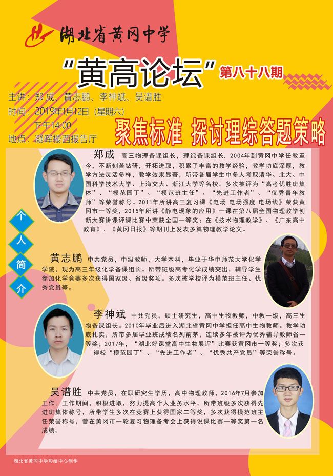 1月12日下午,黃高論壇第88期在西報(bào)告廳開講,本次論壇由高三年級(jí)主辦,主題是“聚焦標(biāo)準(zhǔn) 探討理綜答題策略”。辦公室主任、高三年級(jí)主任劉海英主持活動(dòng),鄭成、黃志鵬、李神斌、吳譜勝四位老師作了主題分享,全體高三理科學(xué)生參與活動(dòng)并聽取講座。